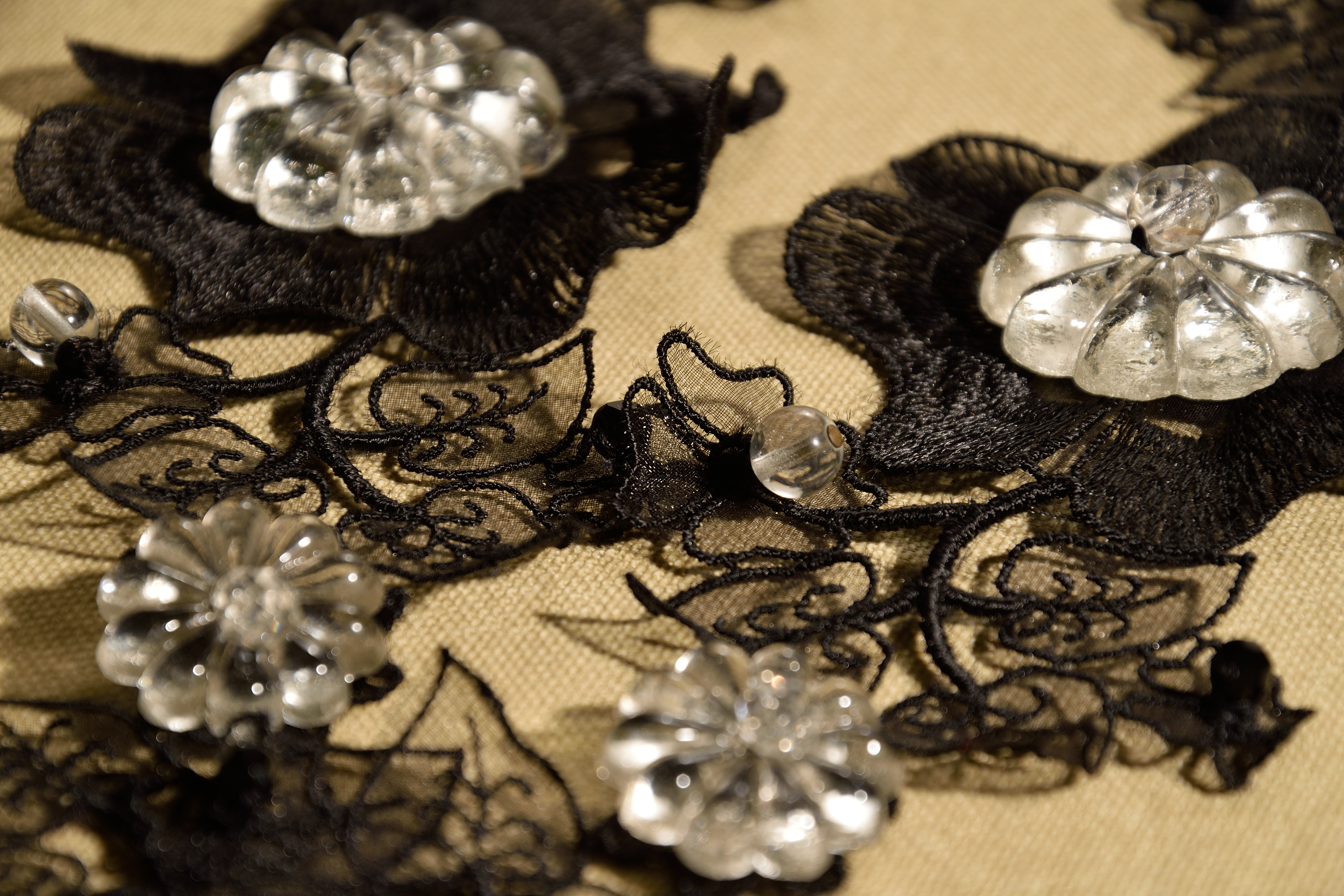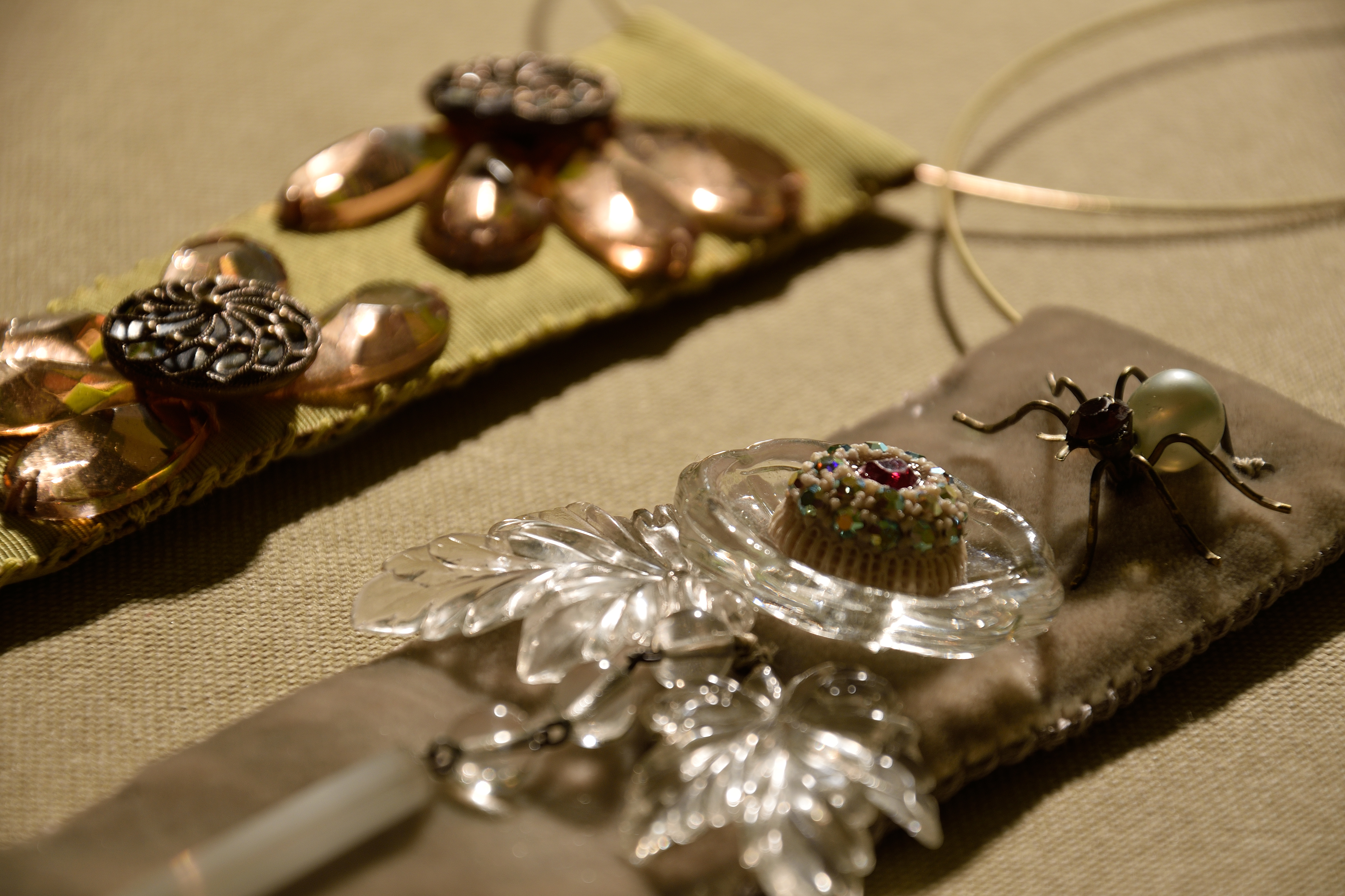 Dalla Sartoria: motivi in resina plastica da ricamo anni ’70, bottoni in metallo, in galalite anni ’30, foglie in plexiglass anni ’80, nastro vintage in velluto di seta, girocollo rigido in ottone anni ’60.